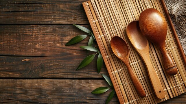 Tablet with wooden utensils on bamboo mat, representing online cooking instructions