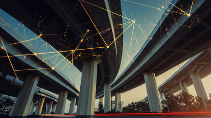 large scale infrastructure scene with abstract overlay of connecting lines, realistic environment, symbolic data and system connectivity