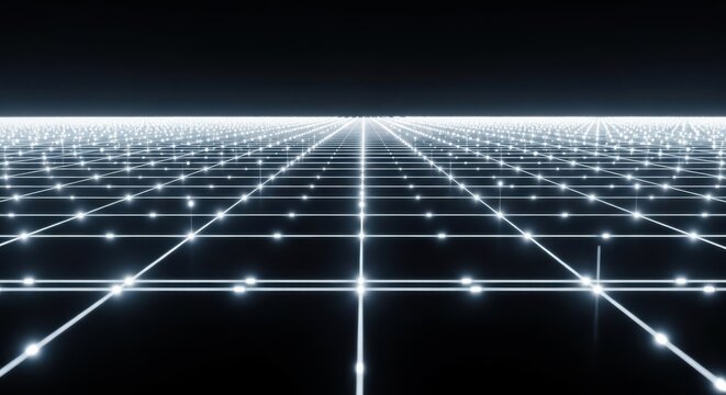 Infinite grid of glowing white dots and lines receding into the distance on a black background, representing data or network