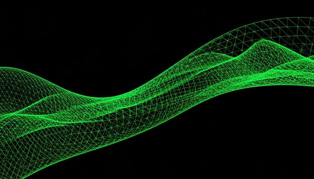 Abstract futuristic technology background with a flowing digital wave of green and blue particles forming a complex grid structure