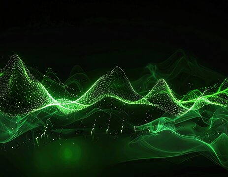 Abstract flowing green wave composed of connected dots and lines forming peaks and valleys on a white background, evoking a sense of dynamic movement and digital connectivity