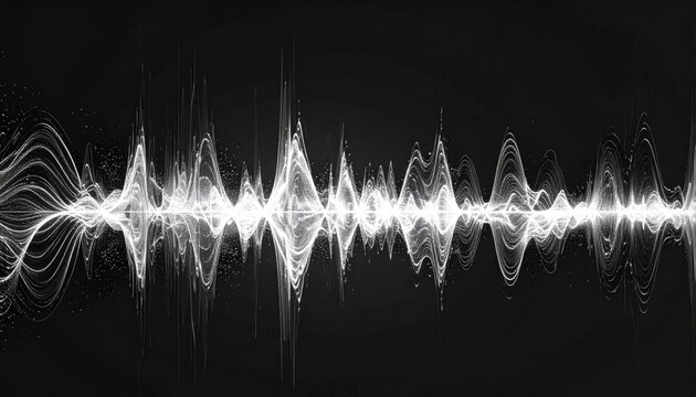 Abstract sound wave visualization with glowing white particles against a dark background representing audio spectrum analysis and digital signal processing in motion