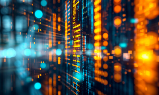 Abstract background with code. Digital data flowing through cyberspace with glowing orange and blue numbers against a deep, shadowy background