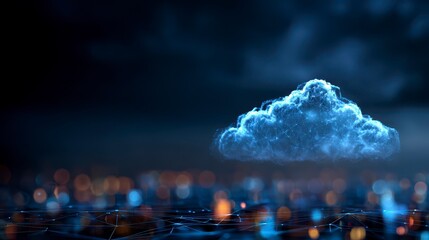 Illuminated cloud hovering above a digital network, with blurred city lights in the background, representing data and technology