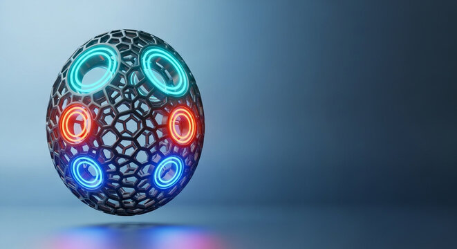 Abstract futuristic sphere with glowing neon rings and internal lights on a clean background