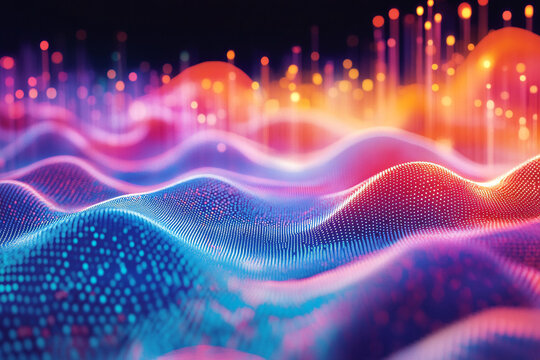 3D rendering of abstract bar graph displaying orange purple  blue columns on a translucent platform with circuit board design