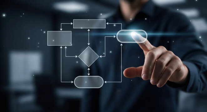 Hand interacting with a digital flowchart, representing decision making and process optimization.