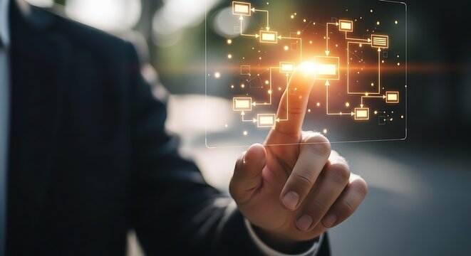 Man interacts with digital user interface. Businessman presses virtual button on futuristic screen. Concept represents tech, data science, automation, business strategy, innovative technology,
