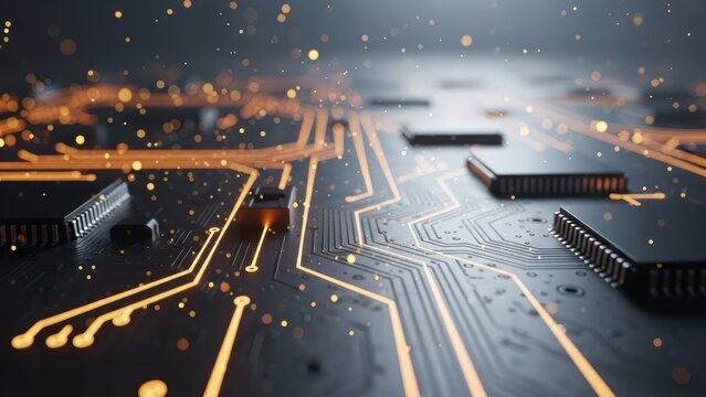 Intricate dark circuit board with glowing orange traces and shimmering light particles