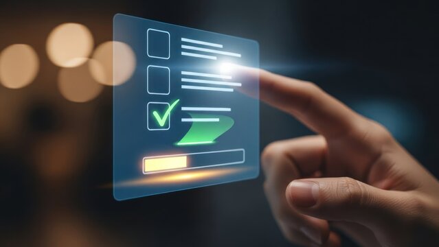A person interacts with a futuristic digital interface displaying glowing checkmark icons indicating successful verification or confirmation in a technological setting high quality