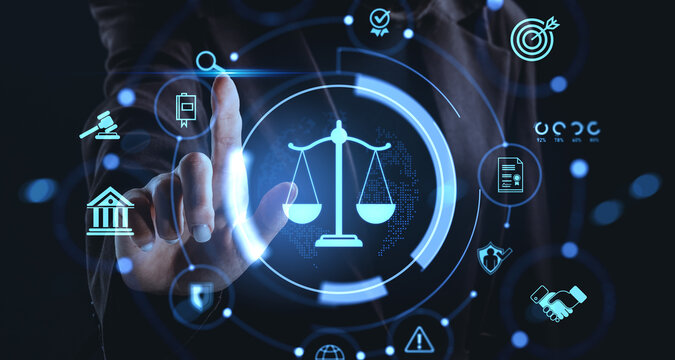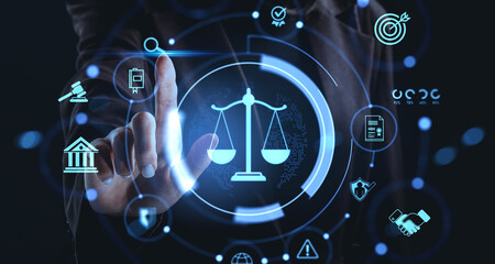 Futuristic justice concept with holographic legal icons and scales of law interface on dark background in blue digital theme..