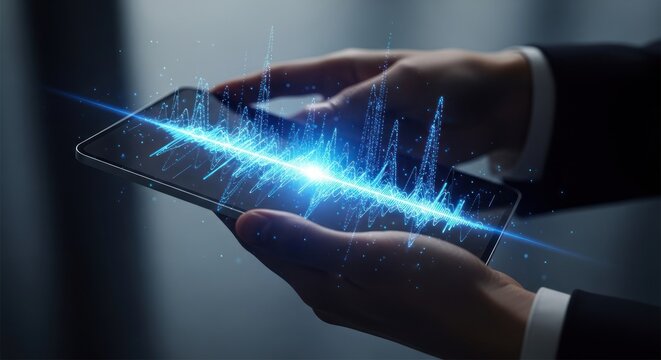 Businessman holding tablet with vibrant blue digital sound wave audio frequency visualization, for signal processing, data analysis, communication technology, complex information flow