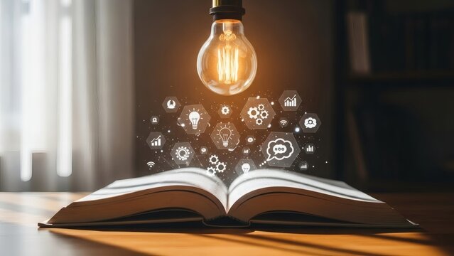 An open book on a wooden surface illuminated from above by a glowing light bulb Hexagonal icons representing concepts like light bulbs gears and bar graphs rise from the book