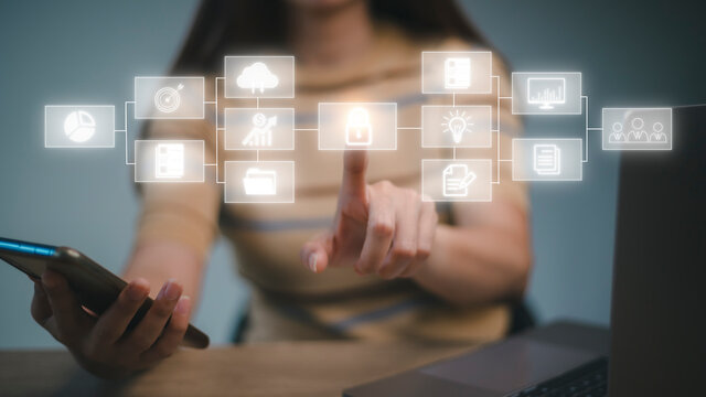 Businessman touchscreen on the graph Screen Icon of a media screen, Technology Process System Business with Communication and marketing concept, Team success, HR Human, Business money success.