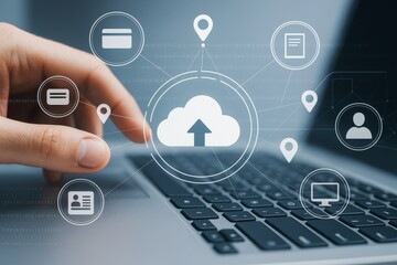Cloud computing interface with user hand interacting on laptop keyboard, digital icons representing online data sharing and storage concept.