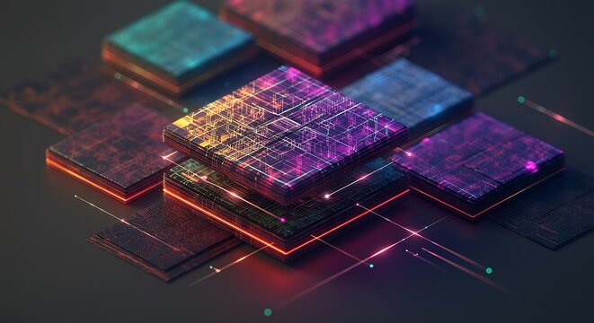 A luminous, rainbow-colored cube with intricate circuit patterns floating in a dark, abstract digital space.