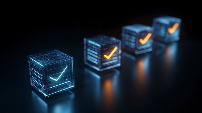 Business professional interacting with a digital interface displaying a verified checkmark and various icons representing business processes and data analysis on a tablet screen