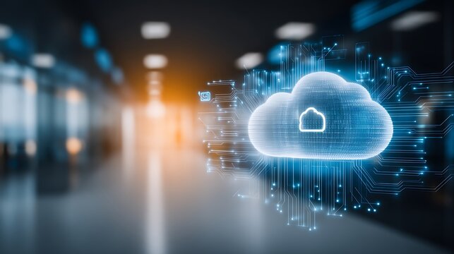 Digital Cloud Illustration with Circuitry and Bright Background in Modern Technology Environment