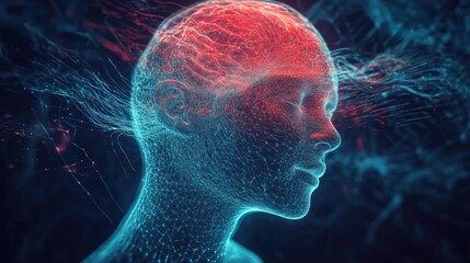 A captivating digital illustration of a human head with glowing lines and vibrant colors, representing thoughts and creativity.