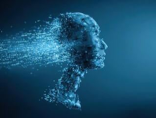 Futuristic abstract human head with blue glowing data streams and crystalline circuitry at the temple, symbolizing AI, neural interfaces, and digital cognition.