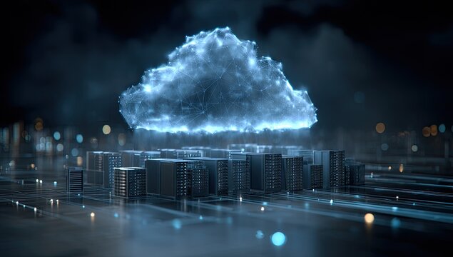 Digital cloud emitting from server stacks, glowing with blue light against dark background