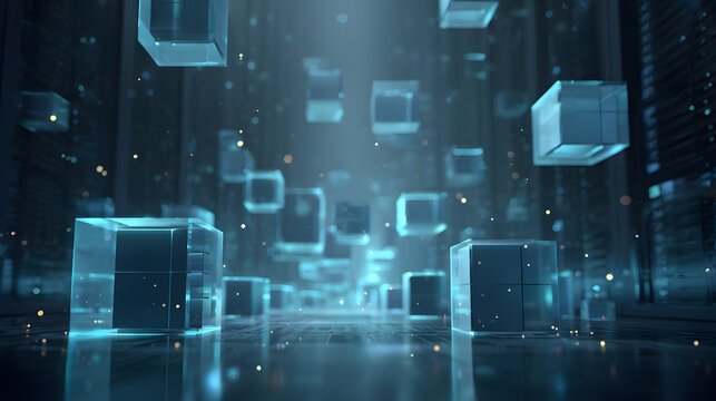 Dynamic digital cubes floating in futuristic data center environment abstract conceptual visuals