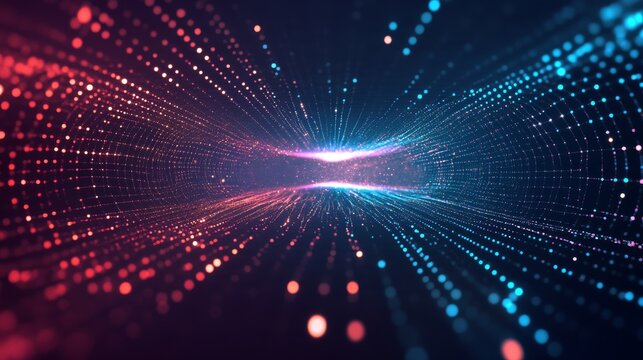 Luminous particles gather towards a center point in an abstract data energy background with a modern AI technology theme and a dark gradient backdrop
