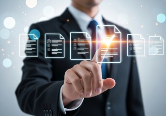 A businessman interacting with digital documents, showcasing modern technology in a sleek office environment.