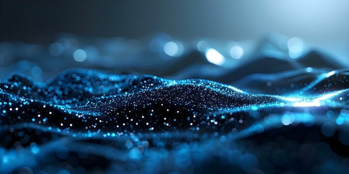 Digital mountains landscape with glowing dots on blue background conveying data mining. Concept Data Mining, Glowing Dots, Mountains Landscape, Digital Art, Blue Background