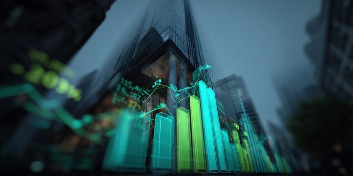 Financial Growth Chart Overlayed on Modern Cityscape, Investment Analysis and Market Data Visualization