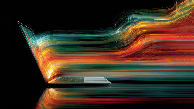 Laptop glowing in the dark with vibrant multicolor data streams, abstract light ribbons, swirling code and graphs, creating dynamic tech and creative visuals.
