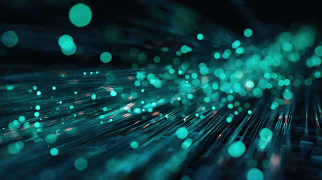 Eco-friendly tech wallpaper with radiant green beams and glowing bokeh highlights on dark background, symbolizing data and sustainability