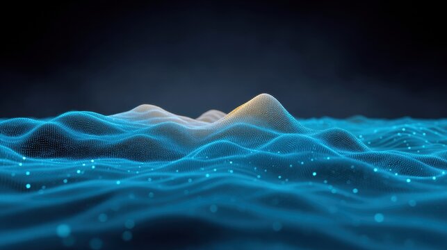 Abstract digital landscape with glowing waves and particles in blue tones, representing data visualization and technological innovation in modern design