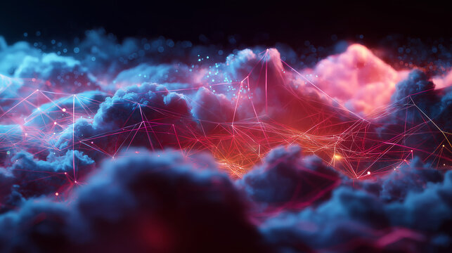 Futuristic cloudscape with glowing red and blue network connections symbolizing digital cloud infrastructure.