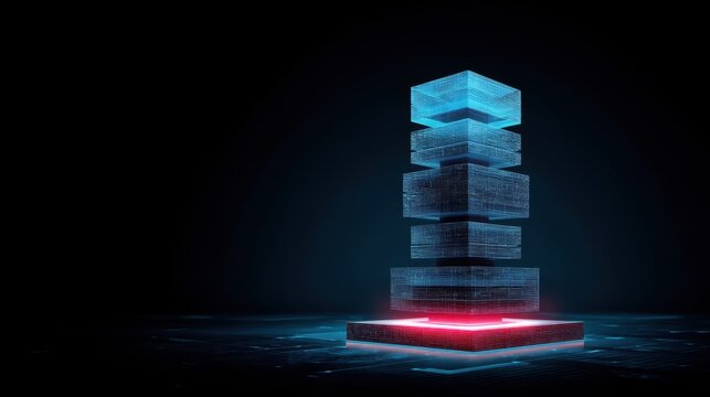 Futuristic Data Tower with Glowing Layers and Neon Effects on Dark Background Representing Digital Technology and Innovation Concepts