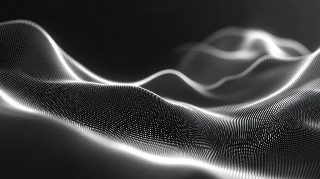Digital particle wave flowing across a dark background, creating dynamic abstract light patterns and representing data, sound frequency, and technological concepts