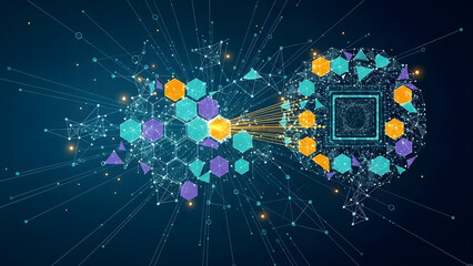Digital data visualization with abstract shapes and microchip illustration in a dark environment from a top viewpoint
