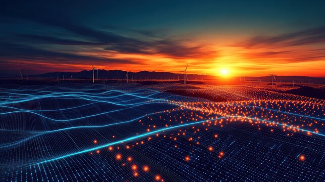 Futuristic Wind Energy Landscape with Digital Network and Sky