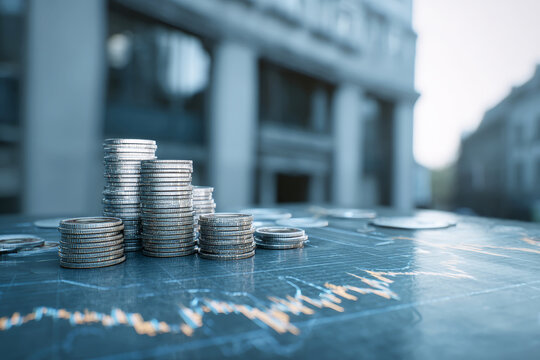 Abstract financial chart displays coins and graphs on table with blurred bank building in professional blue background