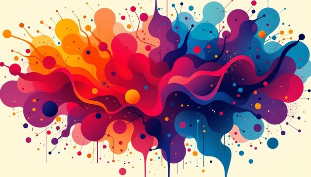 An abstract design with a vibrant explosion of colorful splashes and brushstrokes that resemble a colorful thought bubble or mind map. This artistic representation occupies the majority of the frame