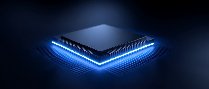 Microchip glowing on smooth matte surface, centered over dark navy blue background with open margins,