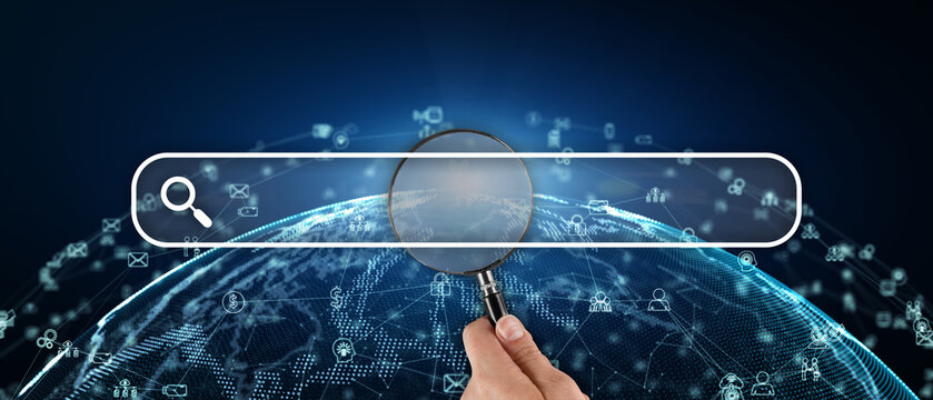 Human hand holds a magnifier in the search bar tab. Creative interface browser.