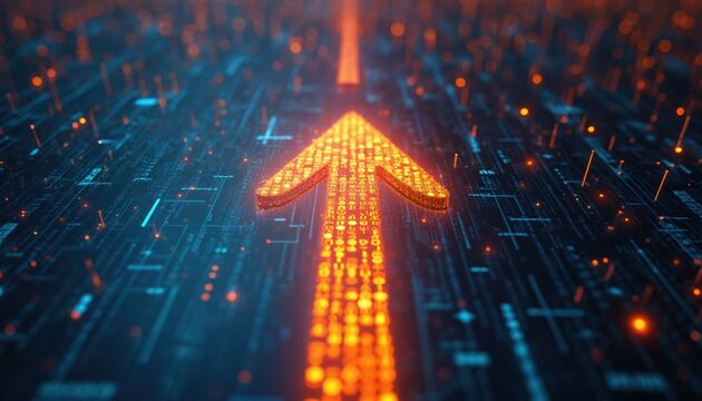 Digital arrow made of data points goes forward over abstract tech background. Concept represents tech growth innovation future vision digital transformation. Modern design illustrates progress