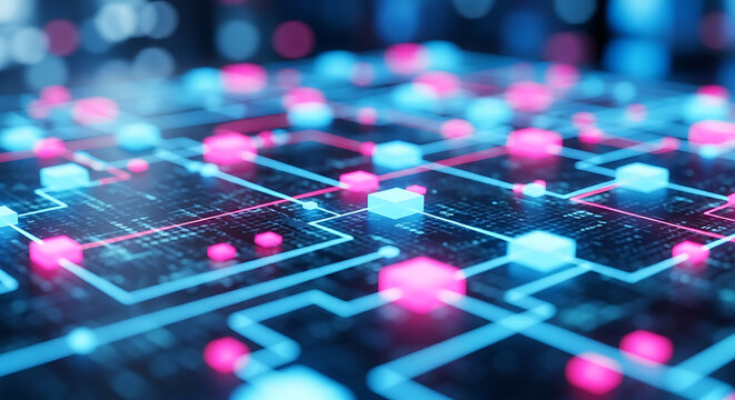 Abstract digital network of glowing blue and pink nodes connected by lines on a dark background, representing technology and data