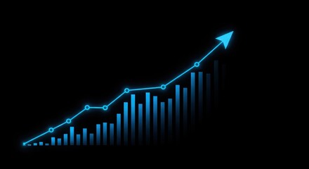 Financial growth graph with dynamic upward trend in blue and black background, representing stock market analysis, investment potential, and economic progress.
