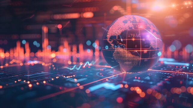 A glowing earth globe with data graphs and charts in the background, representing global connectivity, and economic growth.