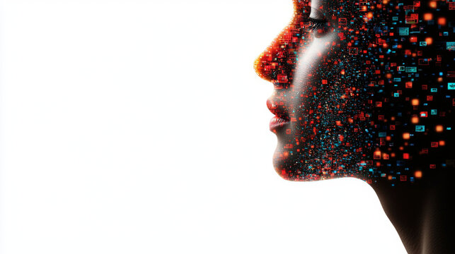 person thinking with digital screens and data charts floating around, representing fusion of technology and human thought