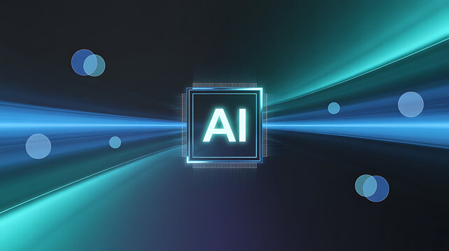Futuristic AI processor glowing at the center of fast moving digital beams with neon lines and luminous waves representing artificial intelligence cyber technology data flow and advanced innovation