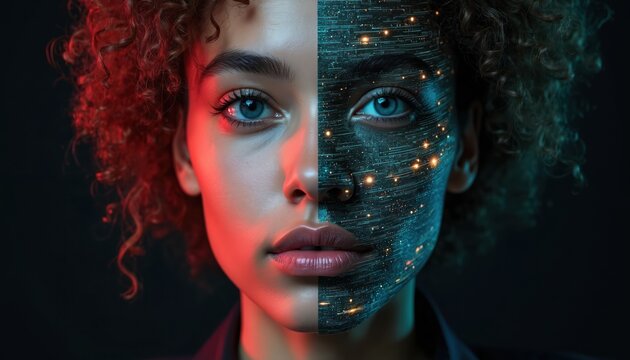 Woman face half organic half digital with glowing circuits and particles. Futuristic cybernetic fusion, human interface, ai connection, data stream, virtual world merge.