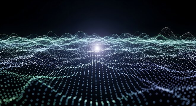 Digital Data Stream: An abstract visualization of a digital data stream, with vibrant blue and purple particles forming a wave-like pattern against a dark background.